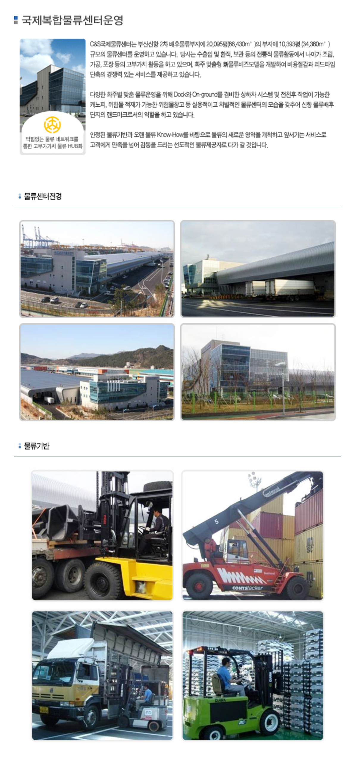 C&S국제물류센터는 부산신항 2차 배후물류부지에 20,095평의 부지에 10,393평 규모의 물류센터를 운영하고 있습니다.