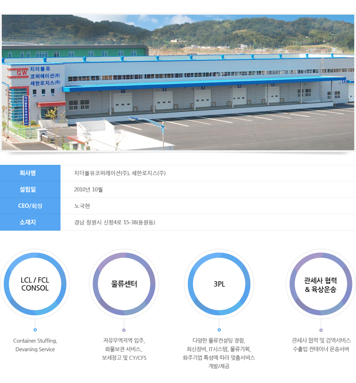 최첨단 설비, 우수한 인력배치, 뛰어난 입지요건으로 차별화된 물류서비스를 제공하는 지더블유코퍼레이션(주) 입니다.