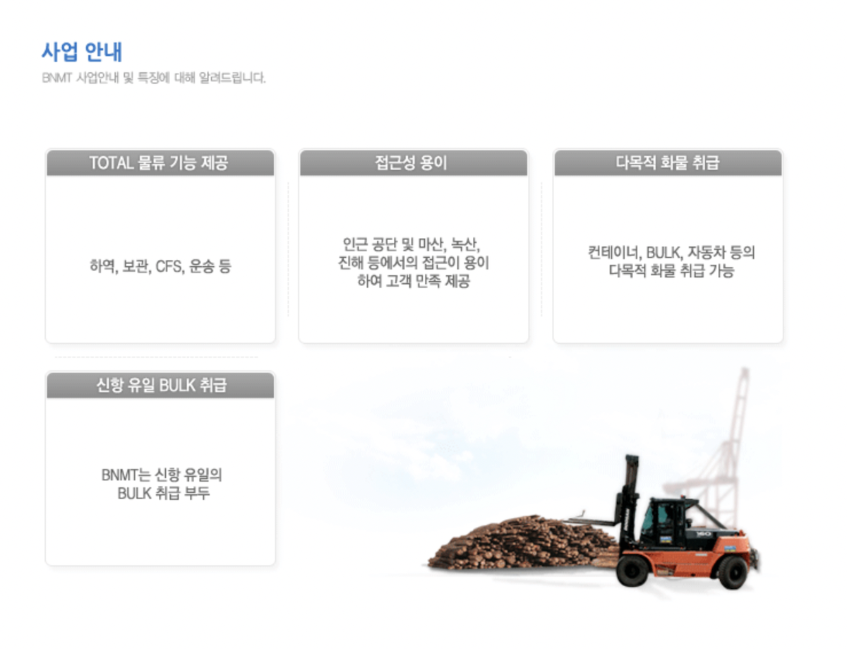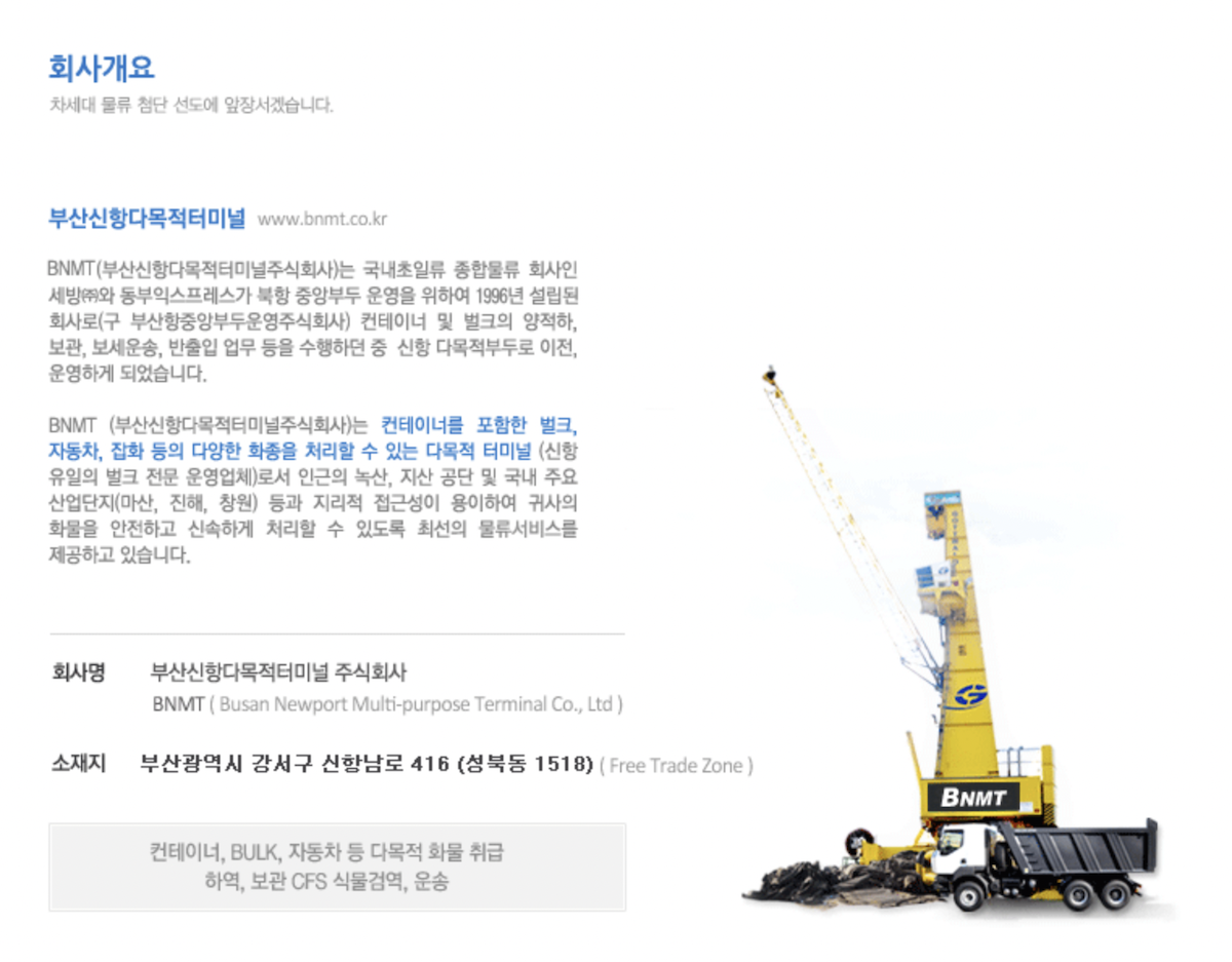 BNMT(부산신항다목적터미널주식회사)는 국내초일류 종합물류 회사인 세방(주)와 동부익스프레스가 북항 중앙부두 운영을 위하여 1996년 설립된 회사(구 부산항중앙부두운영주식회사)입니다.