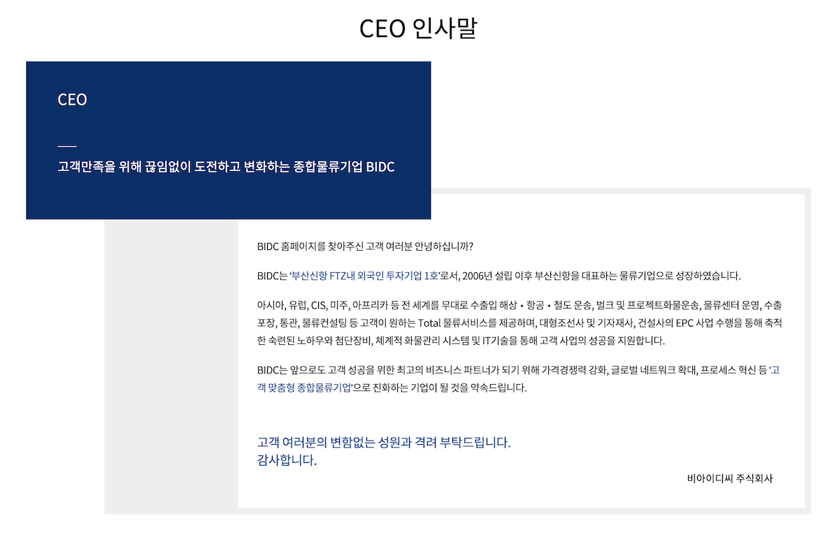 고객만족을 위해 끊임없이 도전하고 변화하는 종합물류기업 BIDC