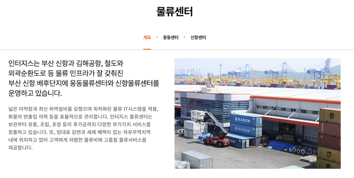 인터지스는 부산 신항과 김해공항, 철도와 외곽순환도로 등 물류 인프라가 잘 갖춰진 부산 신항 배후단지에 웅동물류센터와 신항물류센터를 운영하고 있습니다.