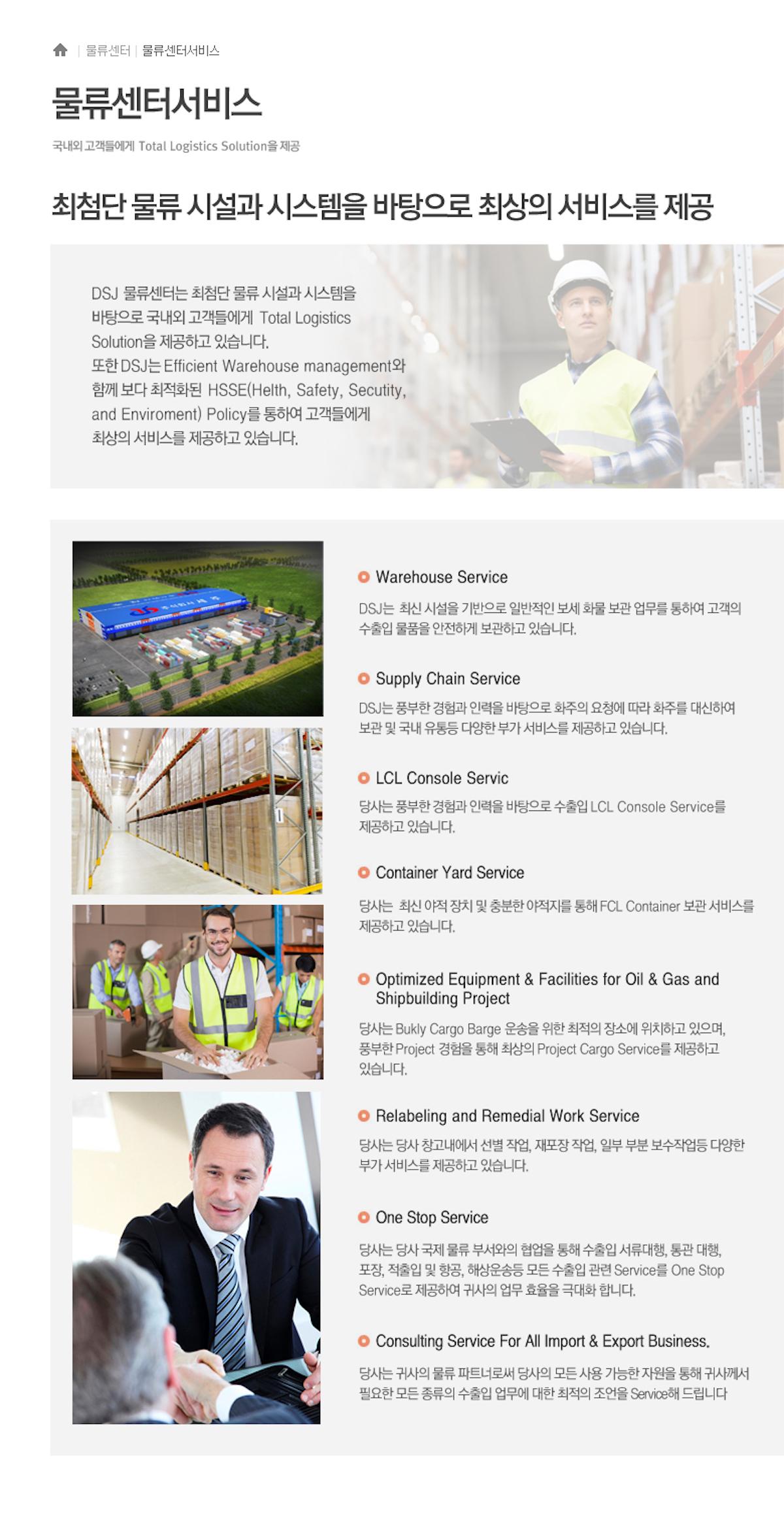 글로벌 종합물류 전문기업 (주)세주디에스제이 당사는 항만하역사업과, 해상운송사업 및 육상운송사업을 기반으로 종합물류기업으로 성장해 왔습니다. 효율적이고 안전한 물류시스템으로 고객 신뢰를 높이고, 신속하고 정확한 물류서비스를 제공합니다.