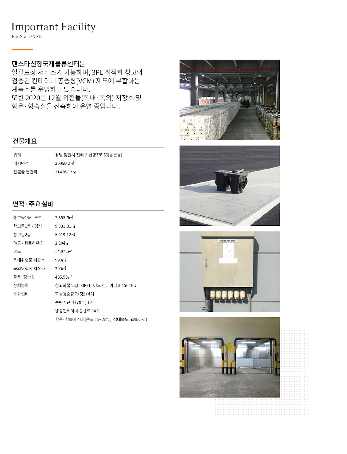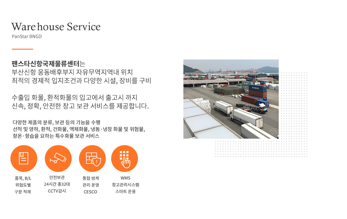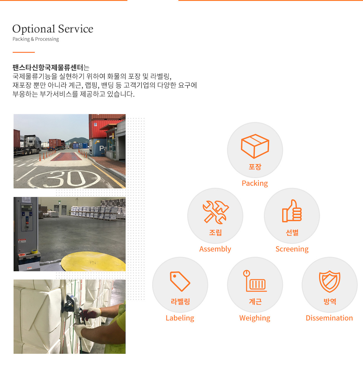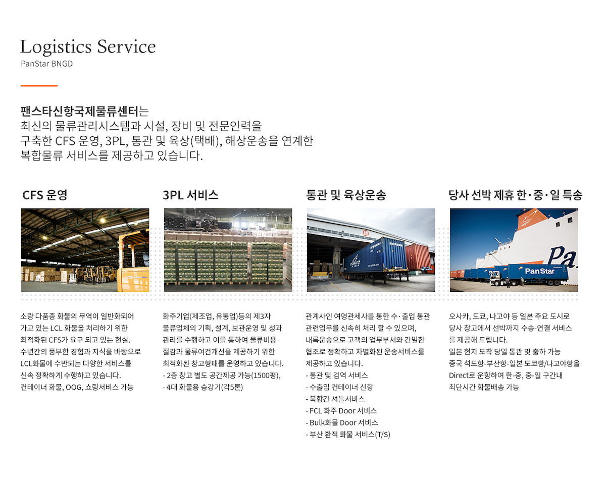 팬스타신항국제물류센터는 해외거점 구축 및 글로벌 물류기업들과의 제휴를 통해 일반유통가공뿐 아니라 부가가치 물류서비스까지 한 번에 제공해 드립니다.