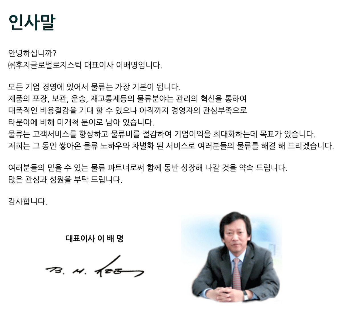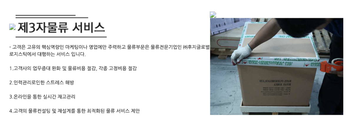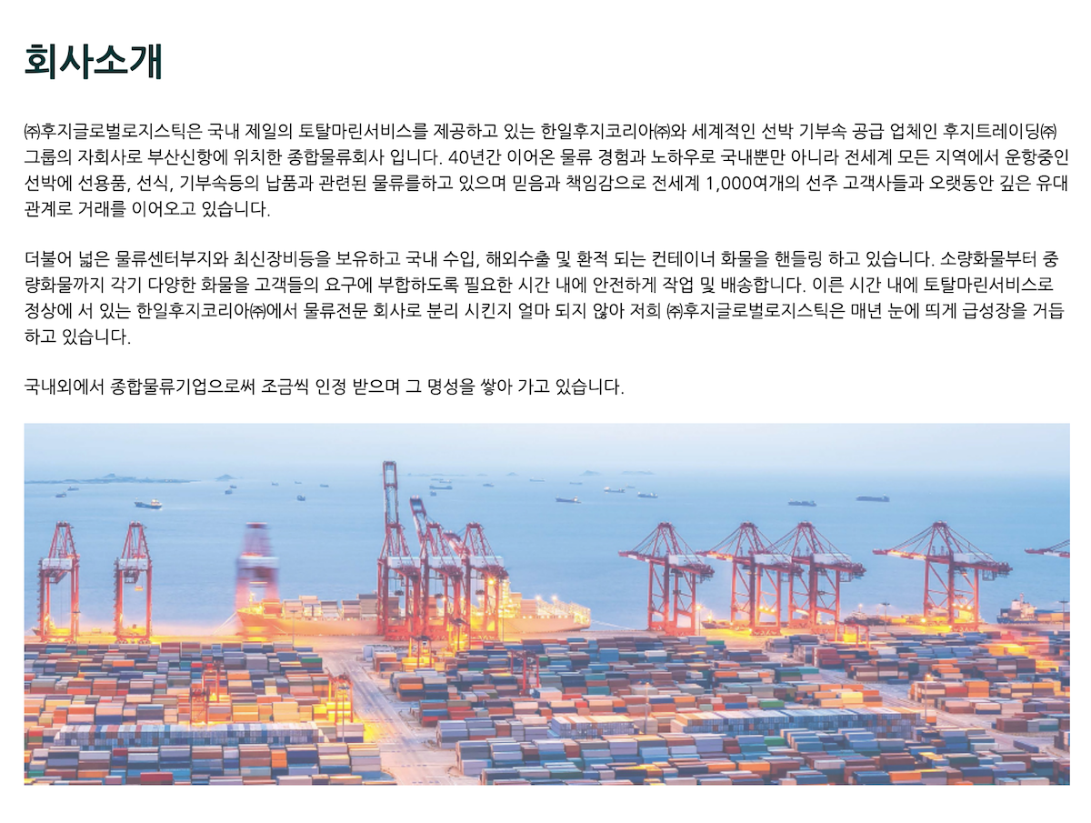 ㈜후지글로벌로지스틱은 국내 제일의 토탈마린서비스를 제공하고 있는 한일후지코리아㈜와 세계적인 선박 기부속 공급 업체인 후지트레이딩㈜ 그룹의 자회사로 부산신항에 위치한 종합물류회사 입니다.