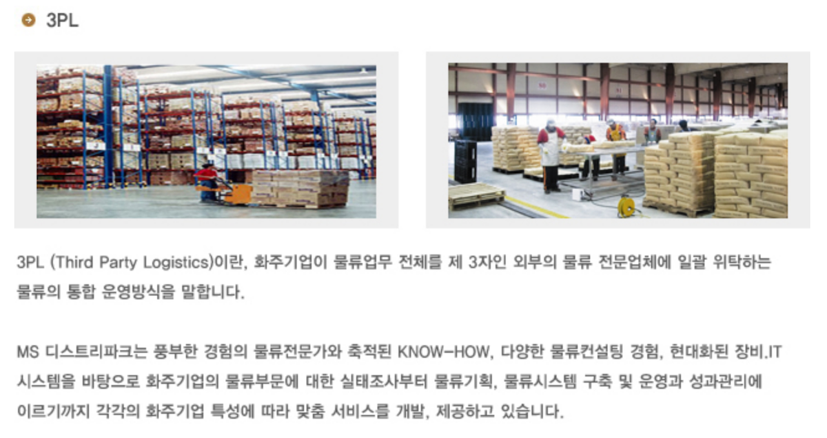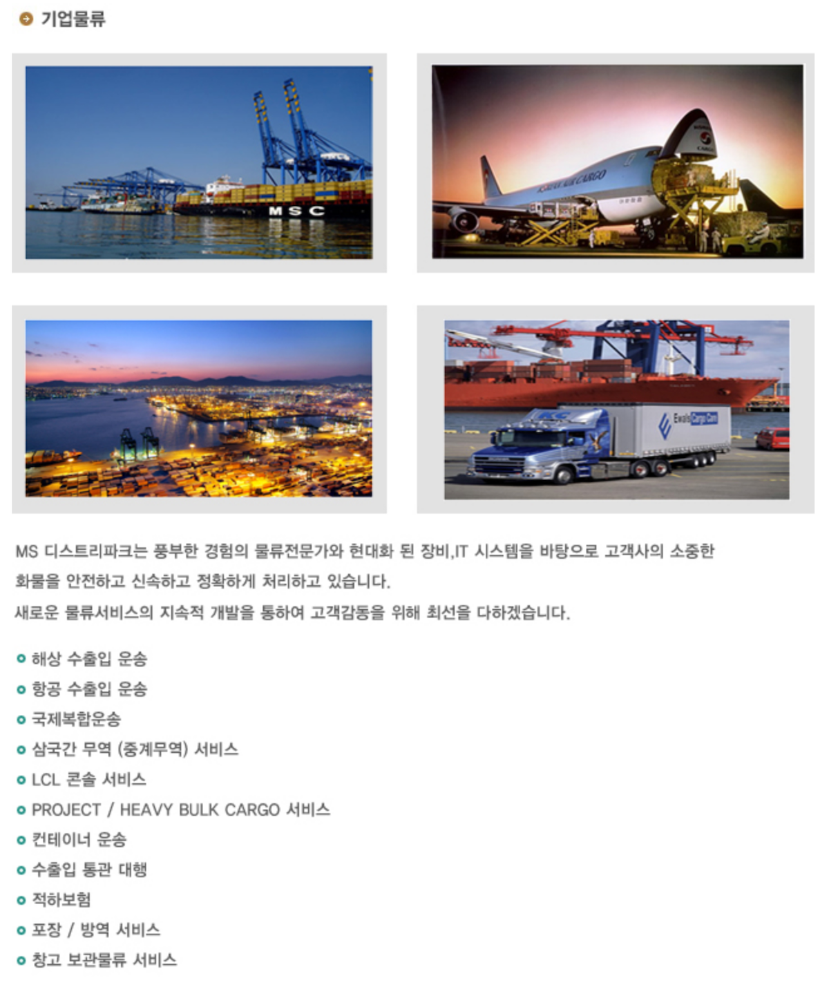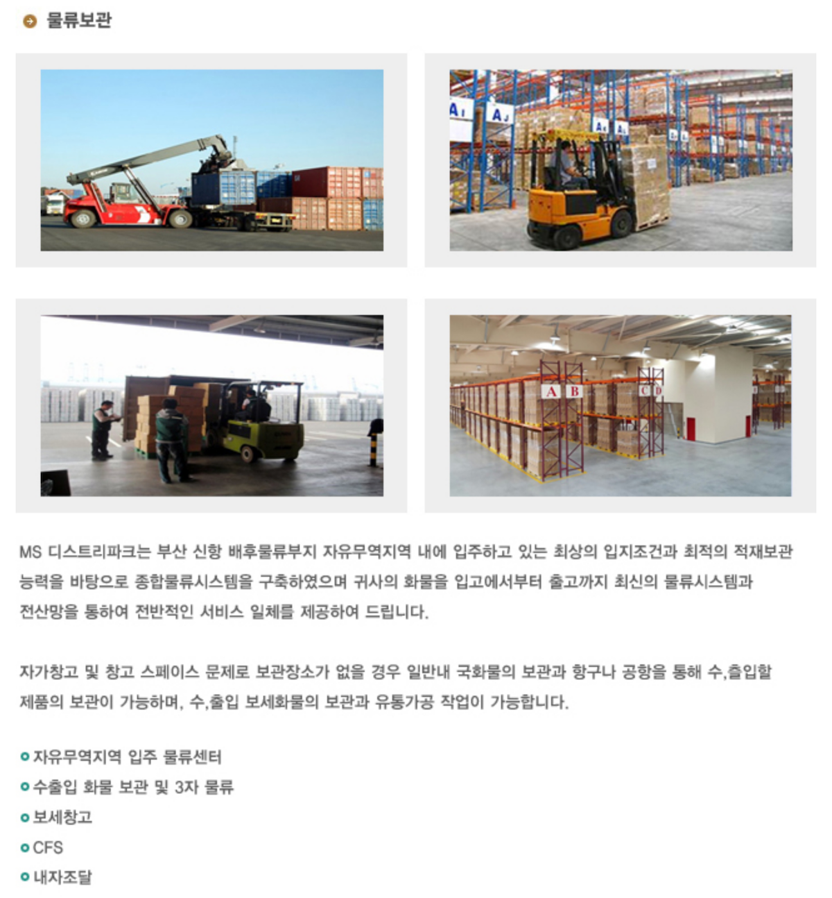 안녕하십니까? MS 디스트리파크㈜는 한국 제1의 소량화물 혼재서비스 및 CY/CFS 운영 업체인 ㈜모락스의 자회사로서 2010년에 부산신항 자유무역지역에 설립된 종합물류기업입니다. MS 디스트리파크는 모기업인 ㈜모락스가 지난 30년간 축적해온 다양한 물류서비스 Know-how를 바탕으로 해상 및 항공 운송, 프로젝트 및 벌크화물 운송에서부터통관, 창고보관업무까지 물류 전 영역을 아우르는 종합서비스를 제공하고 있습니다. 또한 신항터미널과 직접 인접하여 하역시간과 운송비용을 절감할 수 있는 최적의 조건을 갖추고 있으며, 부산항의 지정학적 장점과 365일 운영되는 항만안정성, 풍부한 선박스케쥴, 저렴한 물류비용을 이용하여 “WORLD TO LOCAL, LOCAL TO WORLD”라는 새로운 비즈니스 모델을 구축하여 국내외 수출입기업의 글로벌 물류 HUB로서의 역할을 수행하고 있습니다. 2015년 4월에는웅동지역에 부산신항 최초의 냉동/냉장 물류센터를 완공하여 일반화물에서부터 냉동/냉장 화물까지 아우르는 종합물류서비스를 구축하고 운영하는 명실상부한 종합물류기업으로고객사의 기업경쟁력 제고에 최선을 다할 것입니다. MS 디스트리파크를 방문해 주신 고객 여러분께 진심으로 감사 말씀드리며, 앞으로도 새로운 물류비즈니스 모델을 계속적으로 개발하여 보다 향상된 서비스를 제공할 것을 약속드리며, 귀사의 소중한 비즈니스 파트너가 되겠습니다. 많은 관심과 격려 부탁드립니다. 감사합니다. 주식회사 엠에스 디스트리파크 대표이사 이도희 |