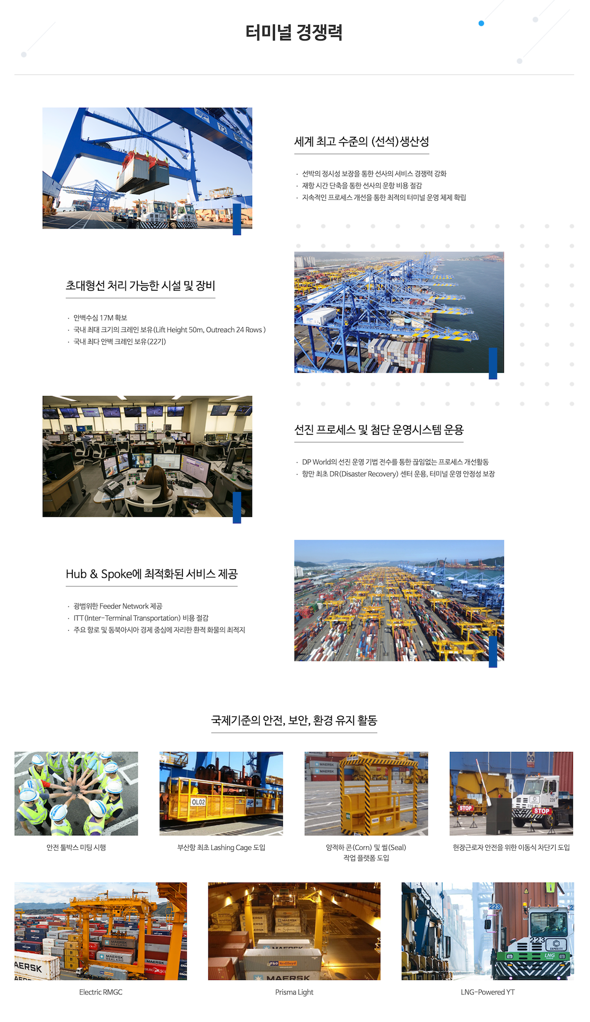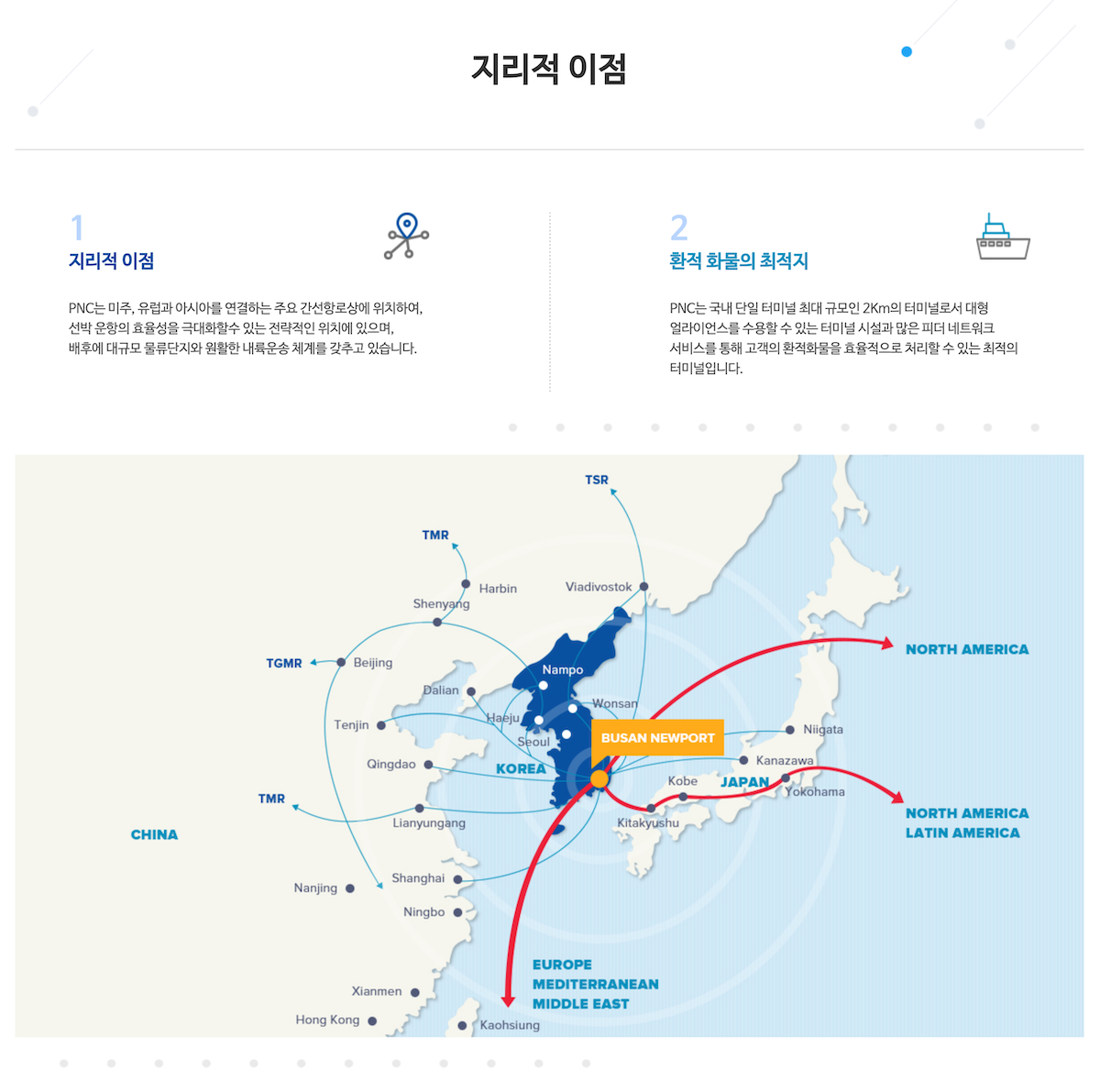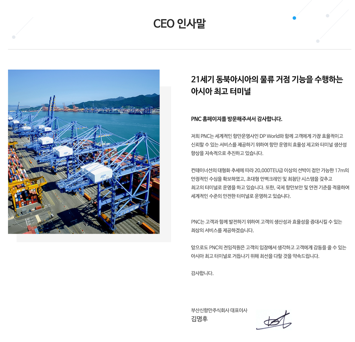 21세기 동북아시아의 물류 거점 기능을 수행하는 아시아 최고 터미널 저희 PNC는 세계적인 항만운영사인 DP World와 함께 고객에게 가장 효율적이고 신뢰할 수 있는 서비스를 제공하기 위하여 항만 운영의 효율성 제고와 터미널 생산성 향상을 지속적으로 추진하고 있습니다.