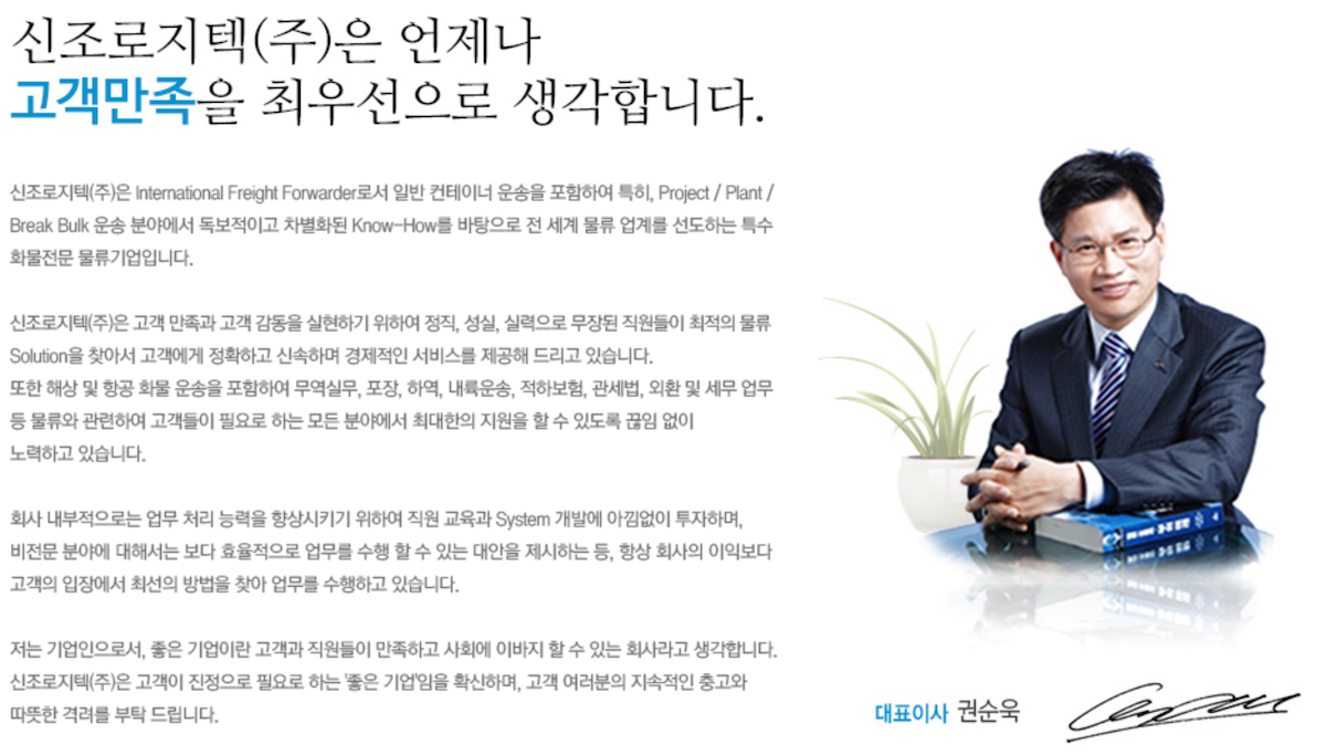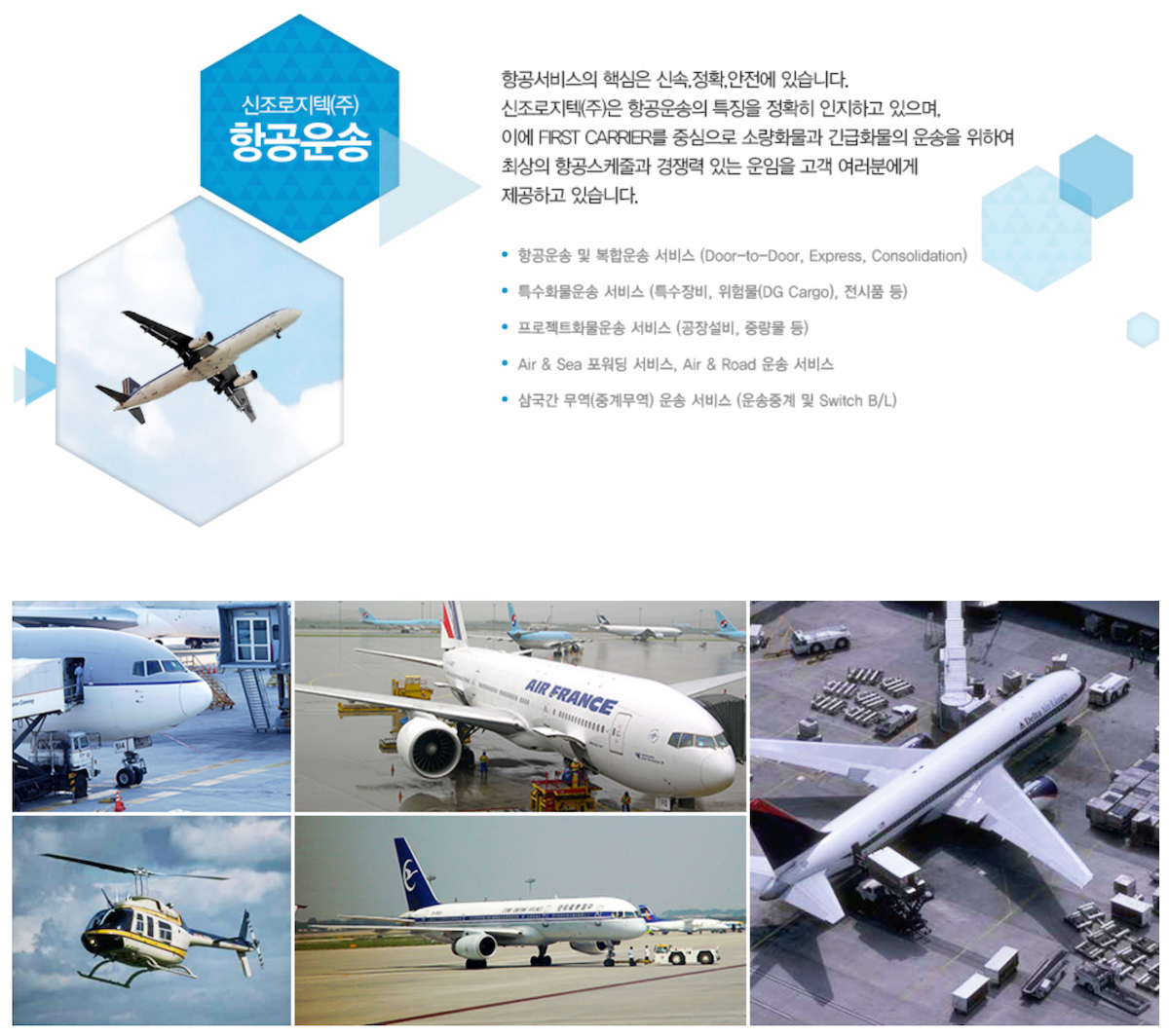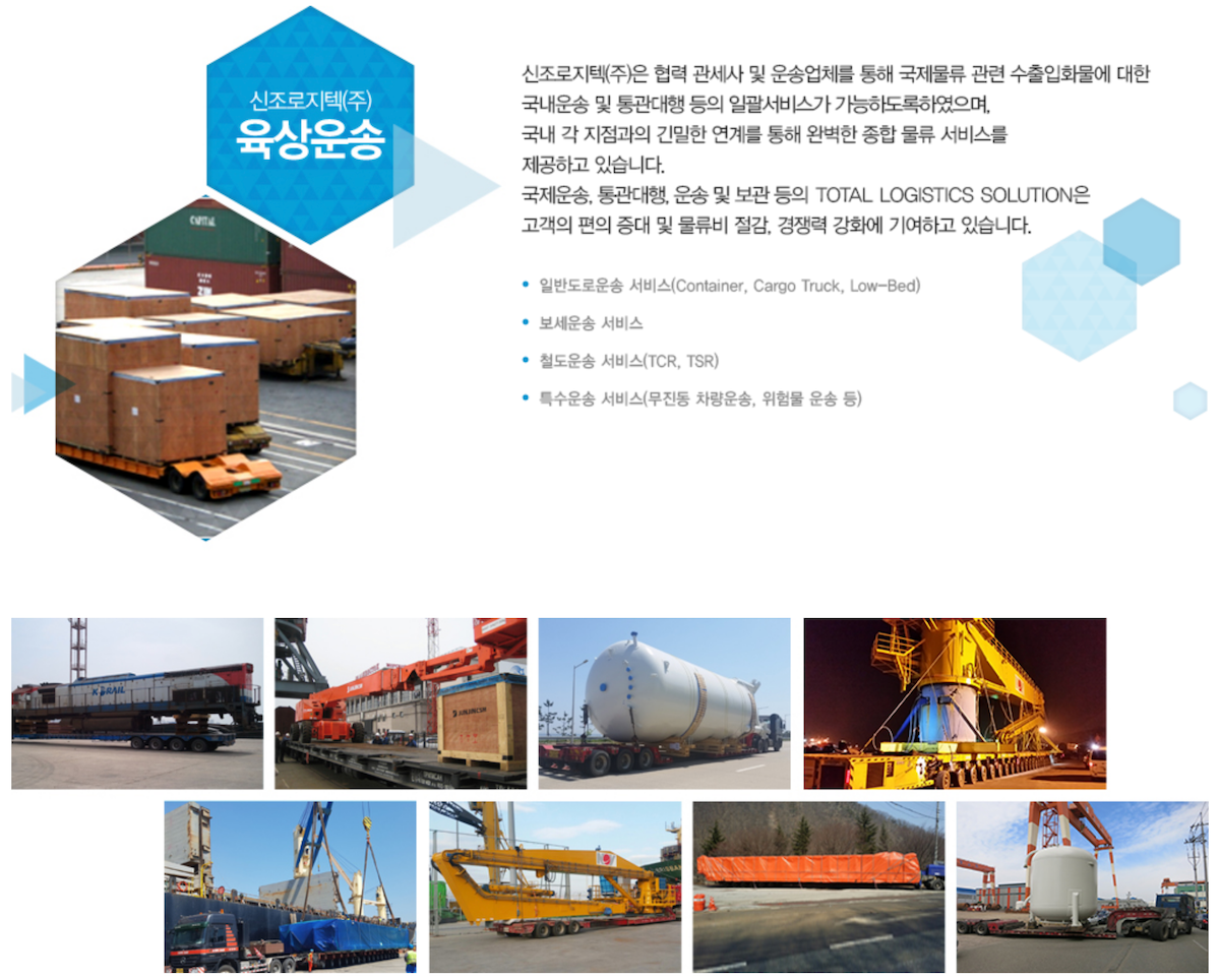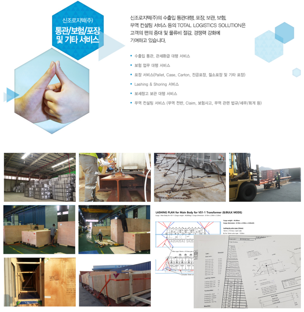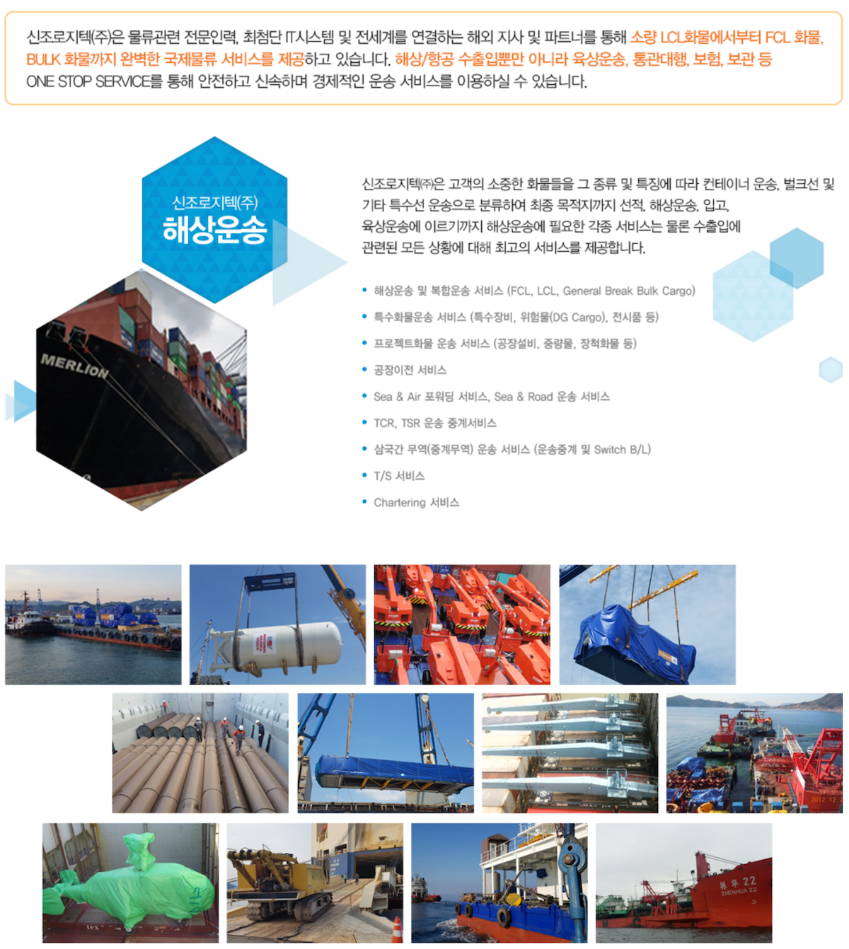 신조로지텍(주)은 물류관련 전문인력, 최첨단 IT시스템 및 전세계를 연결하는 해외 지사 및 파트너를 통해 소량 LCL화물에서부터 FCL 화물, BULK 화물까지 완벽한 국제물류 서비스를 제공하고 있습니다. 해상/항공 수출입뿐만 아니라 육상운송, 통관대행, 보험, 보관 등 안전하고 신속하며 경제적인 운송 서비스를 이용하실 수 있습니다.