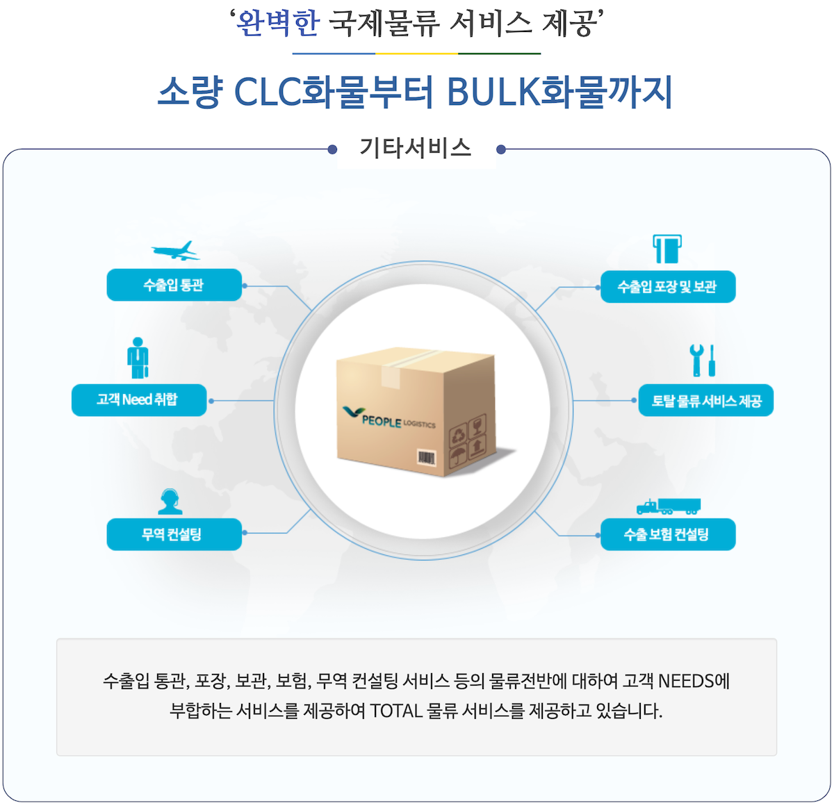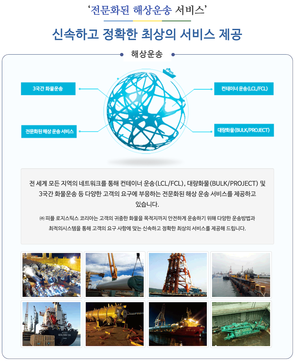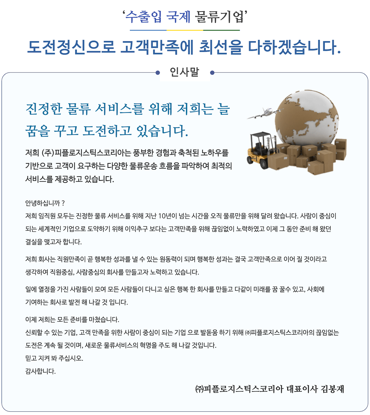 저희 (주)피플로지스틱스코리아는 풍부한 경험과 축적된 노하우를 기반으로 고객이 요구하는 다양한 물류운송 흐름을 파악하여 최적의 서비스를 제공하고 있습니다.