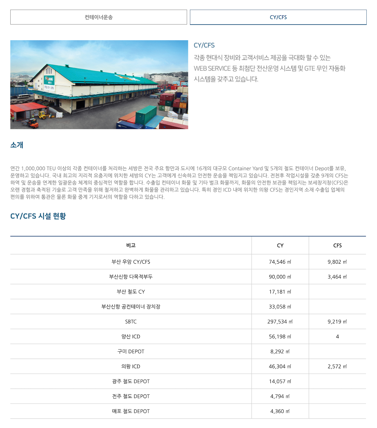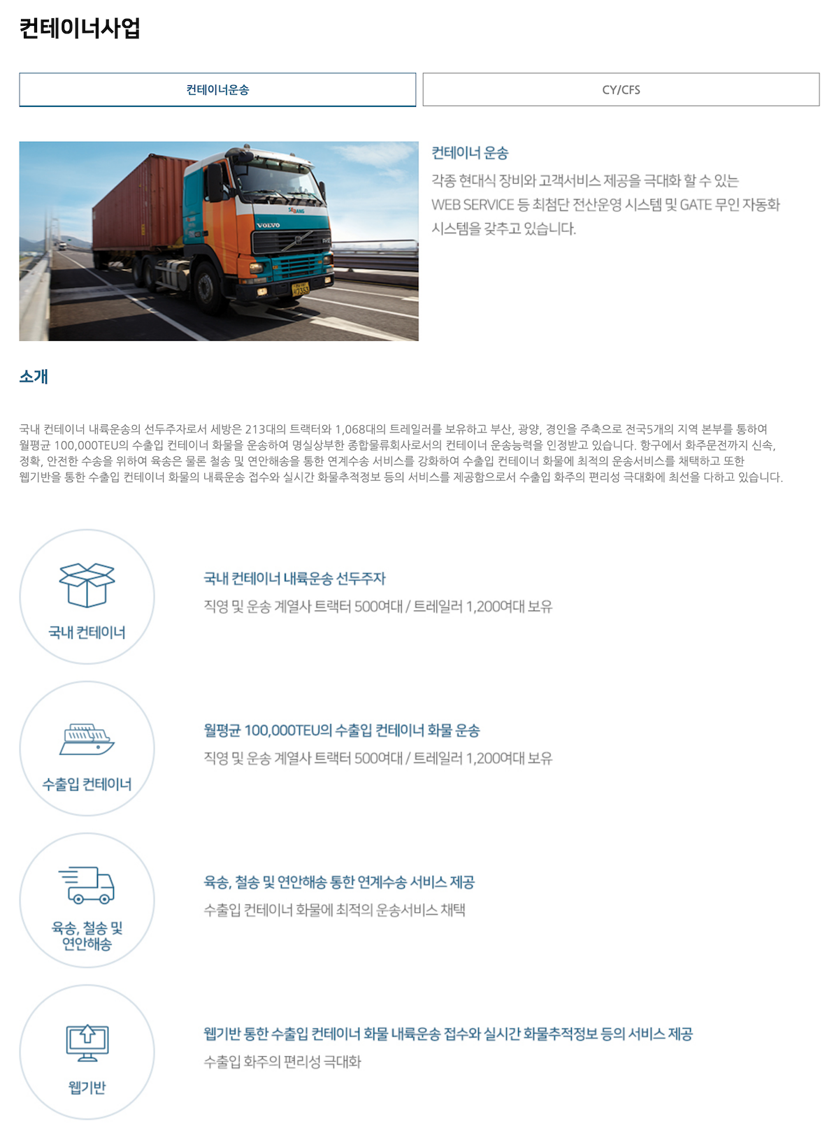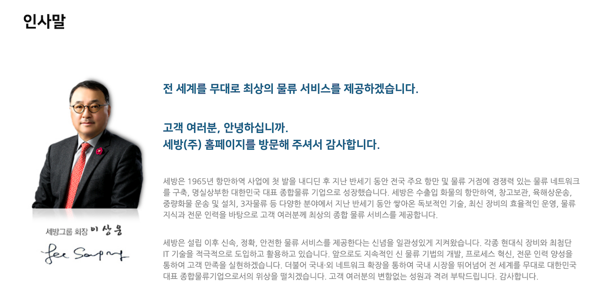 세방은 수출입 화물의 항만하역, 창고보관, 육해상운송, 중량화물 운송 및 설치, 3자물류 등 다양한 분야에서 지난 반세기 동안 쌓아온 독보적인 기술, 최신 장비의 효율적인 운영, 물류 지식과 전문 인력을 바탕으로 고객 여러분께 최상의 종합 물류 서비스를 제공합니다.